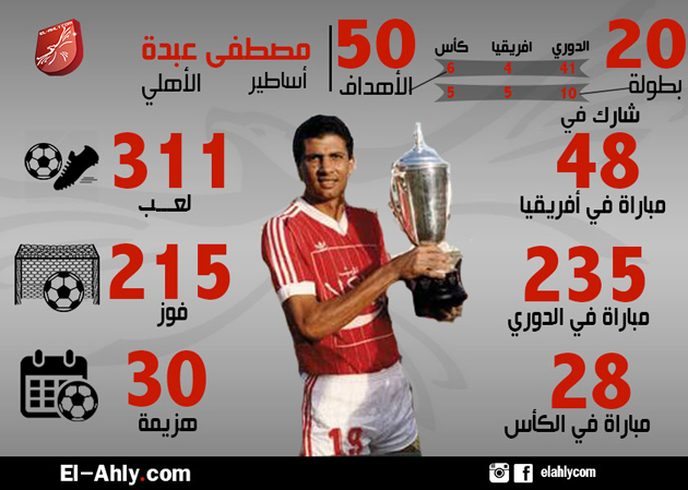 المجري والجناح الطائر .. ألقاب أطلقت على مصطفى عبده لاعب النادي الأهلي السابق والذي شغل مركز الجناح الأيمن لسنوات عديدة داخل جدران القلعة الحمراء منذ تصعيده في 1972. مصطفي عبده بدأ تجربته الأولى الرسمية مع الفريق الاول موسم 1972 – 1973 وكانت أول مباراة له أمام الأوليمبي ليبدأ بعدها المجري مشواره مع النادي الأهلي الذي إستمر لـ 15 موسماً حتى عام 1987. وتمكن لاعب القلعة الحمراء من إحراز 50 هدفاً بقميص النادي الأهلي سواء في بطولة الدوري وكأس مصر وبطولتي كأس إفريقيا أبطال الدوري وأبطال الكئوس، في الوقت الذي ساهم فيه مصطفي عبده في الحصول على 10 بطولات دوري و5 بطولات قارية ومثلهم في كأس مصر. ويقدم El-Ahly.com إنفوجراف عن مسيرة مصطفى عبده مع النادي الأهلي الذي تمكن من الفوز في 215 مباراة من أصل 311 مباراة بينما خسر بقميص المارد الأحمر 30 لقاء فقط.