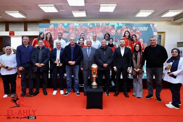 حرص مجلس إدارة النادي برئاسة الكابتن محمود الخطيب، اليوم على تكريم لاعبات الفريق الأول لكرة السلة بالنادي والجهاز الفني والإداري والطبي، بعد التتويج للمرة الأولى بلقب بطولة إفريقيا للأندية التي أقيمت في ضيافة الأهلي على مدار الأيام الماضية. أقيم حفل التكريم في حضور أحمد حسن، رئيس نادي سبورتنج، ومحمد الجارحي عضو مجلس الإدارة رئيس اللجنة العليا المنظمة للبطولة، ورويدا هشام عضو مجلس الإدارة، والدكتور سعد شلبي المدير التنفيذي للنادي وخالد العوضي مدير عام النشاط الرياضي ومدير البطولة.ووجه رئيس النادي الشكر إلى اللجنة العليا المنظمة للبطولة وكافة اللجان الفرعية وإدارات النادي المختلفة على الجهود التي بذلها الجميع لخروج البطولة بالصورة المشرفة التي عكست مكانة الأهلي التاريخية.في ختام التكريم حرص الكابتن الخطيب على إهداء درع خاص إلى رئيس نادي سبورتنج؛ تقديرا للعلاقات المميزة بين الناديين، وهو ما تمثل في مشاركة هاجر عامر لاعبة سبورتنج مع الأهلي في البطولة، والذي قام بدوره بإهداء الكابتن محمود الخطيب درع ناديه، كما قدم رئيس الأهلي دروعا تذكارية للجهاز الفني والإداري والطبي واللاعبات.